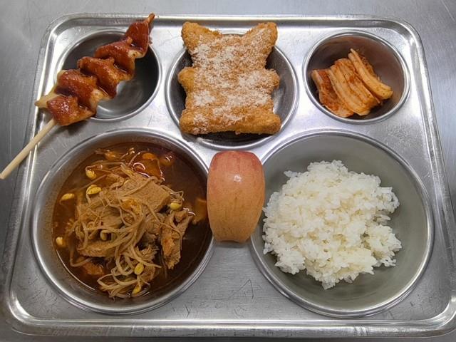 석식 친환경쌀밥 얼큰남도물갈비(5.6.13.18) 매운꼬치어묵(1.5.6.13.16) 피카지파이&시즈닝(1.2.5.6.13.15) 직접담은김치(자율)(9) 사과