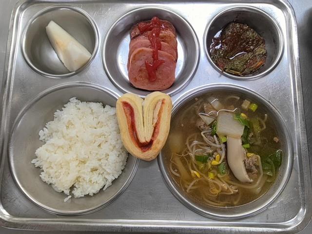 조식 친환경쌀밥 얼큰쇠고기무국(5.16) 햄구이&케첩(10.12) 깻잎김치(9) 딸기잼팔미어파이(1.2.5.6) 배(과일)