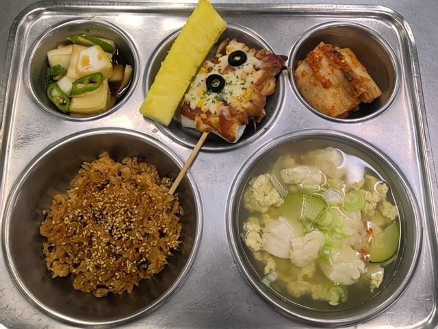 석식 감자탕볶음밥(5.6.9.10) 맑은순두부탕(1.5.8.9.18) 양파초절임(5.6.13) 직접담은김치(자율)(9) 소떡위피자(5.6.10.12.15) 파인애플스틱