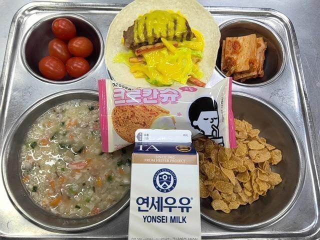 조식 게맛살야채죽(1.5.6.8) 떡갈비스낵랩(1.2.5.6.10.15.16.18) 직접담은김치(자율)(9) 곡물시리얼(5.6) 미니크로칸슈(1.2.5.6) 방울토마토(12) 시리얼우유(2)