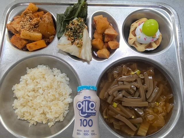 중식 노랑차조밥 도토리묵국(5.6.8.9.18) 양배추케일쌈&양념장(5.6) 닭갈비&떡사리(1.2.5.6.13.15.16.18) 직접담은깍두기(자율)(9) 과일생크림와플(2.5.6)(샤인머스켓) 플레인요구르트(2)