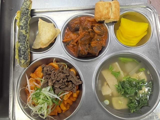 석식 차돌누들떡볶이(1.2.5.6.8.9.12.13.16.18) 맑은어묵국(1.5.6.8.9.18) 매콤순대볶음(2.5.6.10.13.16) 롱김말이&콘치즈만두(2.5.6.10.12.15.16.18) 단무지(자율) 미니뺑오초콜릿(1.2.5.6)