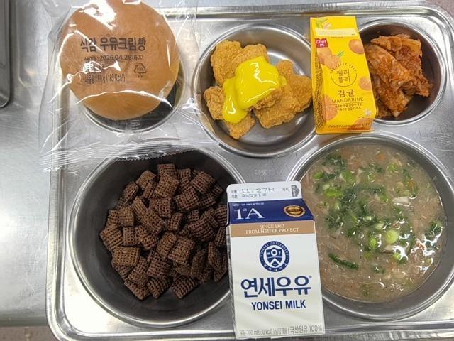조식 참치야채죽(5.6.16.18) 우유크림빵(1.2.5.6.10) 치킨너겟&머스타드(1.2.3.5.6.15.16) 직접담은김치(자율)(9) 감귤젤리 시리얼우유(2) 초코첵스시리얼(5.6)