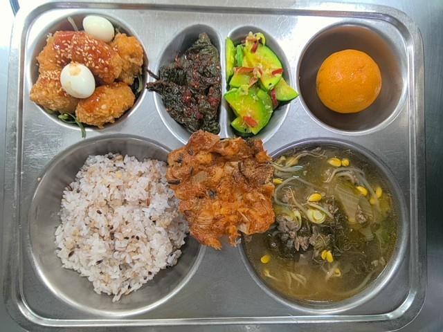 중식 혼합잡곡밥(5) 사골우거지국(5.6.16) 애호박나물(자율)(9) 오징어김치전(1.5.6.9.17) 파둥지닭강정(1.2.5.6.12.15.16.18) 깻잎김치(9) 감귤(밀감)