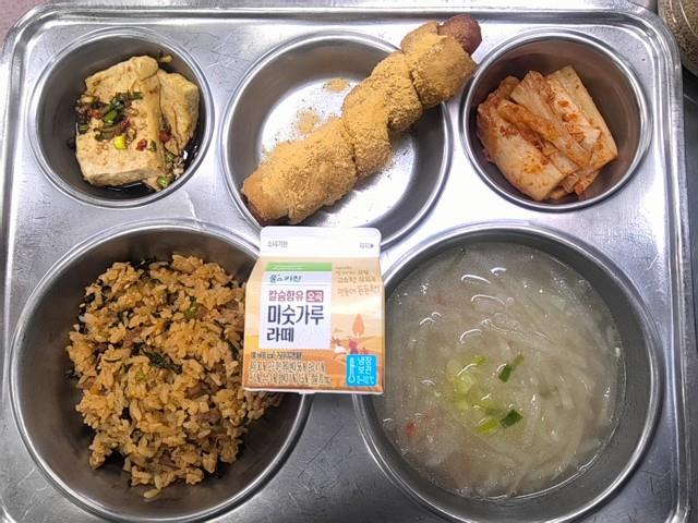석식 매콤훈제오리볶음밥(5.6) 들깨무채국(8.9.18) 간장두부조림(5.6.13) 빵글빵글회오리핫도그(1.2.5.6.10.15.16) 직접담은김치(자율)(9) 미숫가루라떼(2)