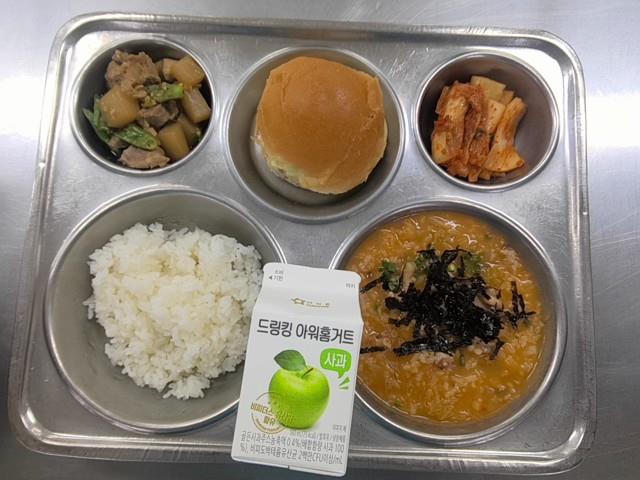 조식 친환경쌀밥 낙지야채죽(8.9.18) 돼지고기곤약장조림(5.6.10.13) 직접담은김치(자율)(9) 우리밀모닝빵샌드위치(1.2.5.6.13) 드링킹요구르트(사과)(2)