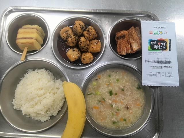 조식 친환경쌀밥 새우야채죽 (5.6.9.13) 토스트꼬치 (1.2.5.6.10.15) 맛김 구운바삭치킨볼 (2.5.6.12.15.16.18) 직접담은김치(자율) (9) 바나나
