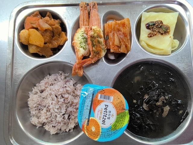 중식 검정쌀밥 쇠고기미역국 (5.6.8.9.16.18) 매운돼지갈비찜 (2.5.6.10.13) 치즈블랙타이거새우구이 (9.13) 배추김치 (9) 밀감푸딩 양배추숙쌈(자율) (5.6)