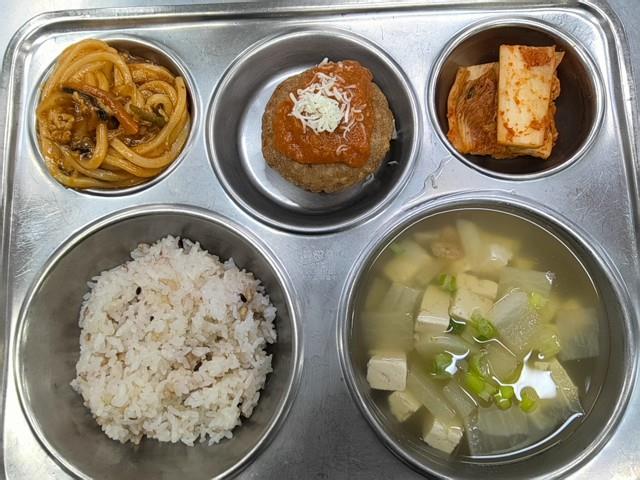 석식 혼합잡곡밥 (5) 두부탕국 (5.6.8.9.13.18) 매콤굴소스볶음우동 (5.6.10.13.18) 에그인헬함박 (1.2.5.6.10.12.15.16) 배추김치 (9)