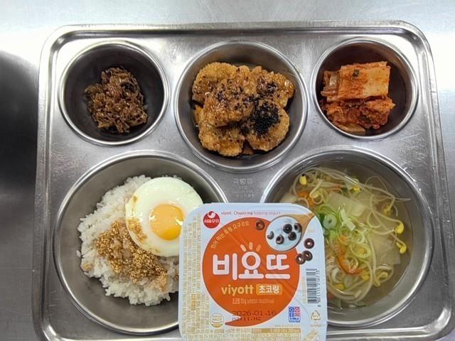조식 간장계란밥(1.5.6) 얼큰콩나물국(5.8.9.18) 멸치고추장볶음(5.6.13) 크리스피돈육강정(2.5.6.10.12.16.18) 직접담은김치(자율)(9) 토핑요거트(2.5)