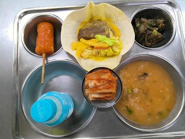 조식 낙지야채죽(8.9.18) 가지굴소스볶음(5.6.13.18) 겉바속쫀떡꼬치(1.2.5.6.12.13.16) 떡갈비스낵랩(1.2.5.6.10.15.16.18) 직접담은김치(자율)(9) 밀크맛음료(2.5)