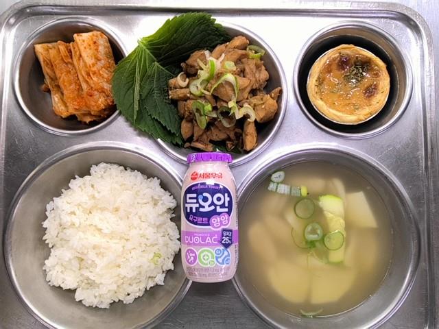 석식 친환경쌀밥 수제비국(5.6.8.9.18) 데리야끼닭구이&깻잎 쌈(5.6.13.15.18) 직접담은김치(자율)(9) 수제마롱타르트(1.2.5.6.13.16) 요구르트(2)