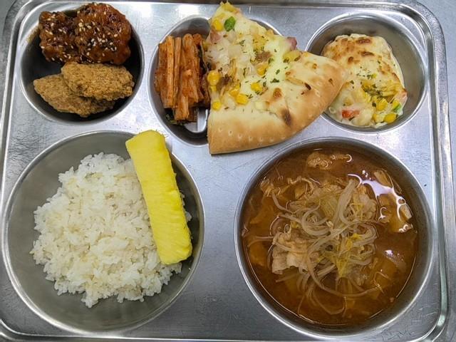 중식 현미밥 얼큰샤브샤브국(2.5.6.13.16) 돼지갈비맛후라이드(후반양반)(1.5.6.12.13.15) 콘치즈구이(1.2.5.13) 직접담은김치(자율)(9) 미트콤보고구마피자(1.2.5.6.10.12.15.16) 파인애플스틱