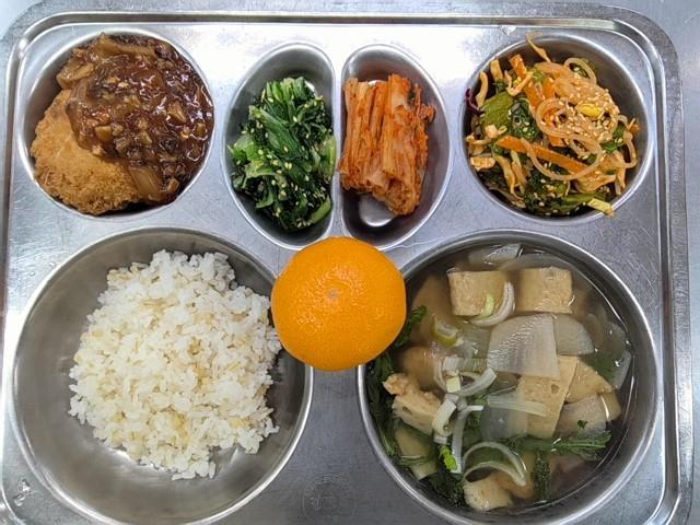 중식 찰보리밥 맑은어묵국(1.5.6.8.9.18) 단배추나물(자율)(5.6) 쫄면채소무침(5.6.13) 치즈폭탄등심돈까스&소스(1.2.5.6.10.12.13.16.18) 직접담은김치(자율)(9) 감귤(밀감)