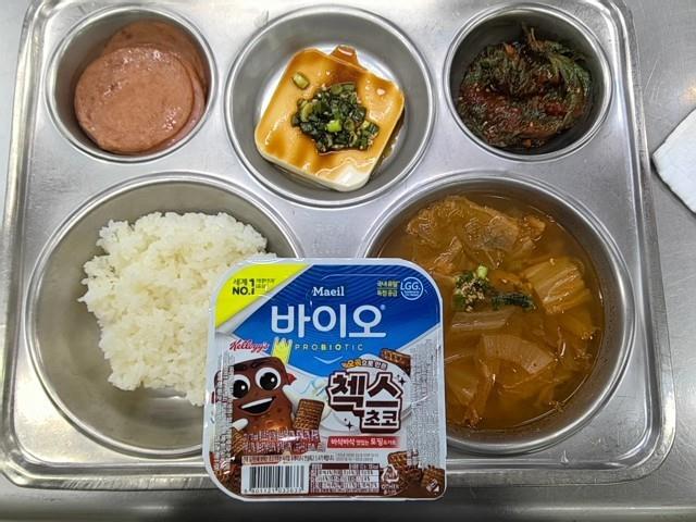 조식 친환경쌀밥 돈육김치찌개(8.9.10.18) 연두부&양념장(5.6) 싸먹는오리햄(1.2.5.6.10.16) 깻잎김치(9) 토핑요거트(첵스초코)(2.5.6)
