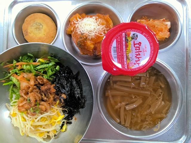 석식 주꾸미채소비빔밥(5.6) 도토리묵국(5.6.8.9.18) 에그인헬스테이크 (1.2.5.6.10.12.13.15.16.18) 직접담은김치(자율)(9) 오미자주스 수제식호떡(1.2.4.5.6)